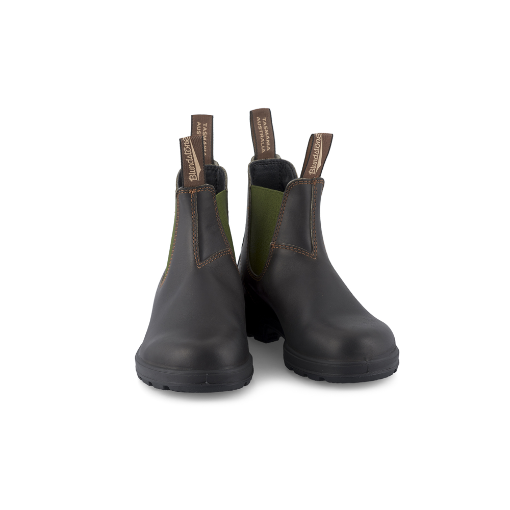 Distinctive olive green elastic side panels of our #519 are set against dark brown leather uppers. Designed with comfort in mind the PU midsole is anatomically shaped while the hard-wearing outsoles provide stability, and removable EVA footbeds add extra comfort. Iconic Blundstone made for work and play.