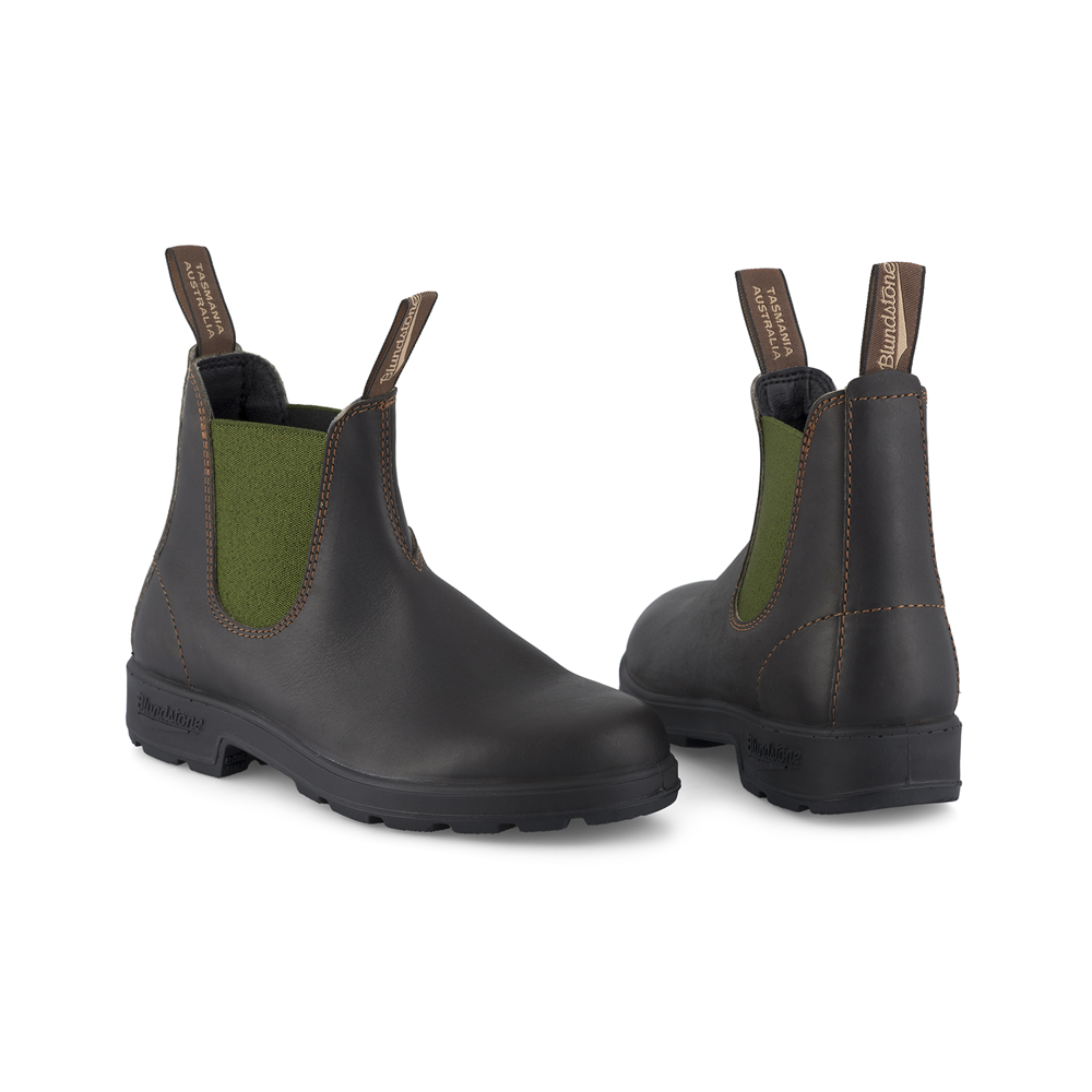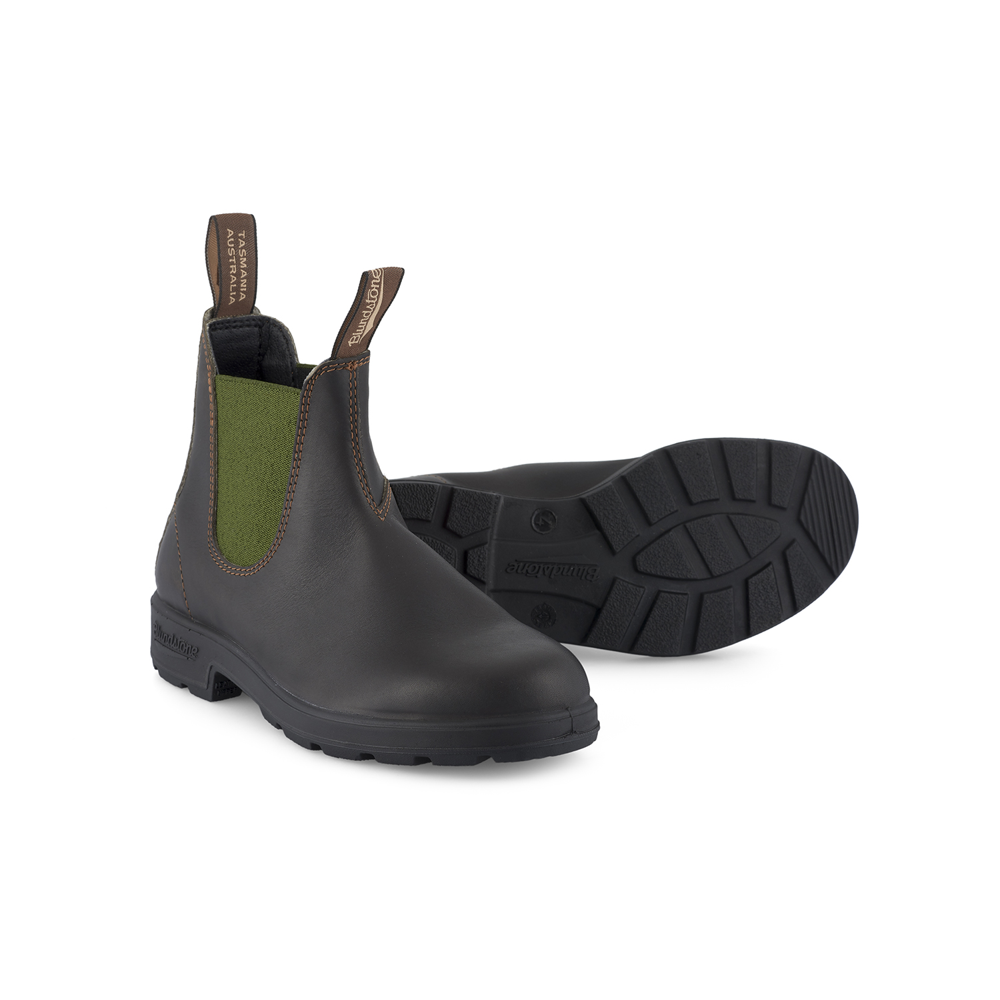Distinctive olive green elastic side panels of our #519 are set against dark brown leather uppers. Designed with comfort in mind the PU midsole is anatomically shaped while the hard-wearing outsoles provide stability, and removable EVA footbeds add extra comfort. Iconic Blundstone made for work and play.